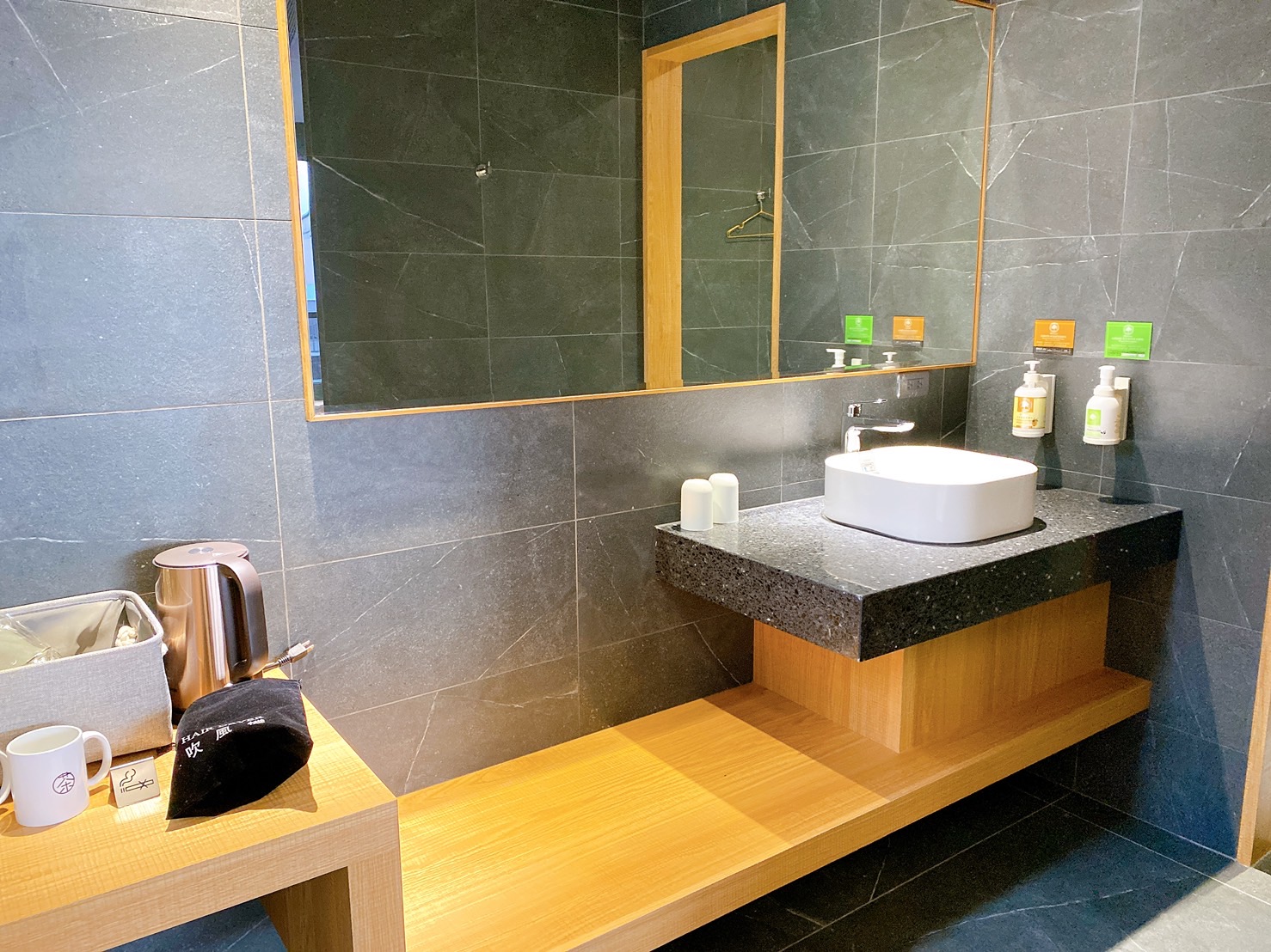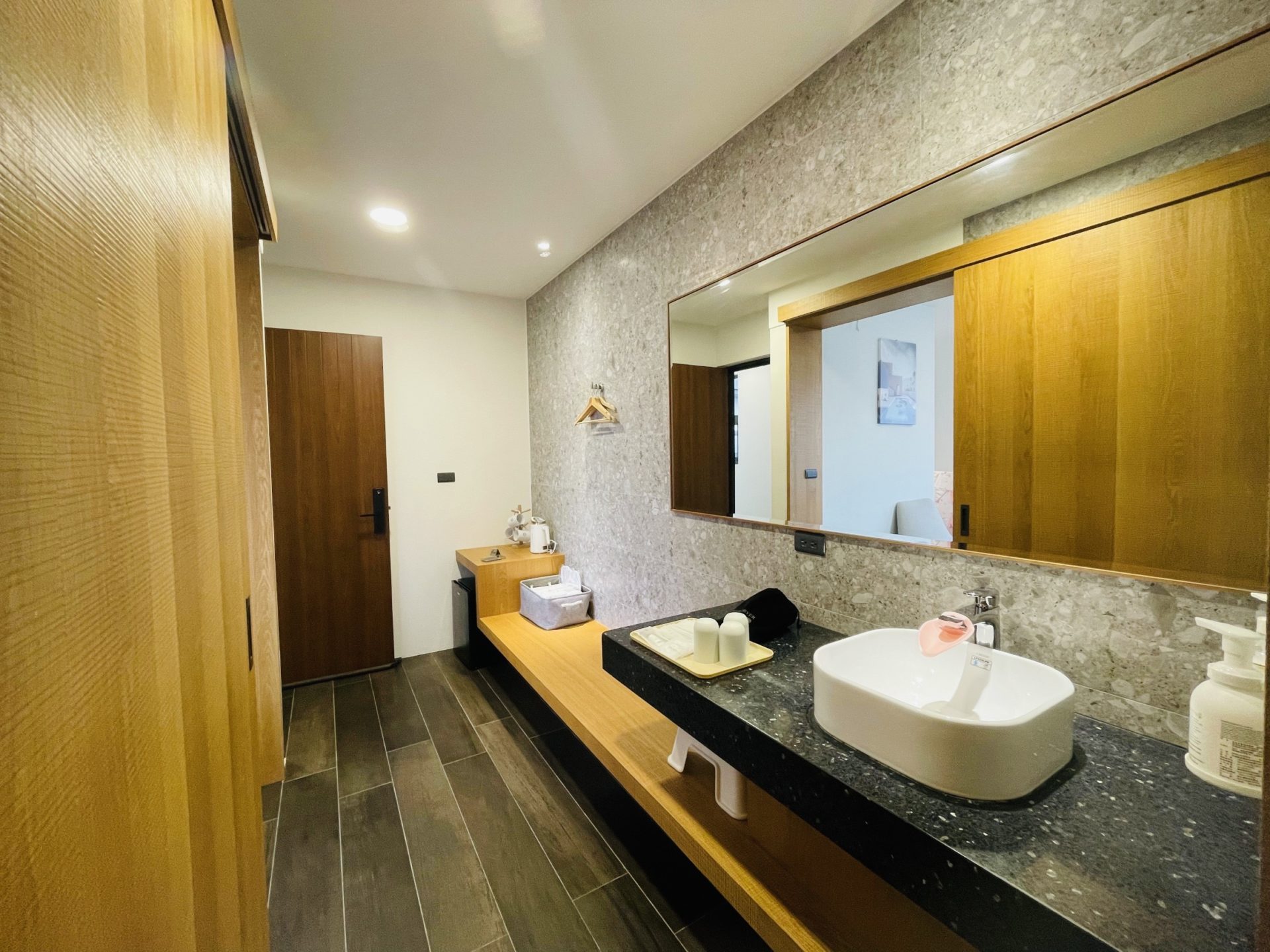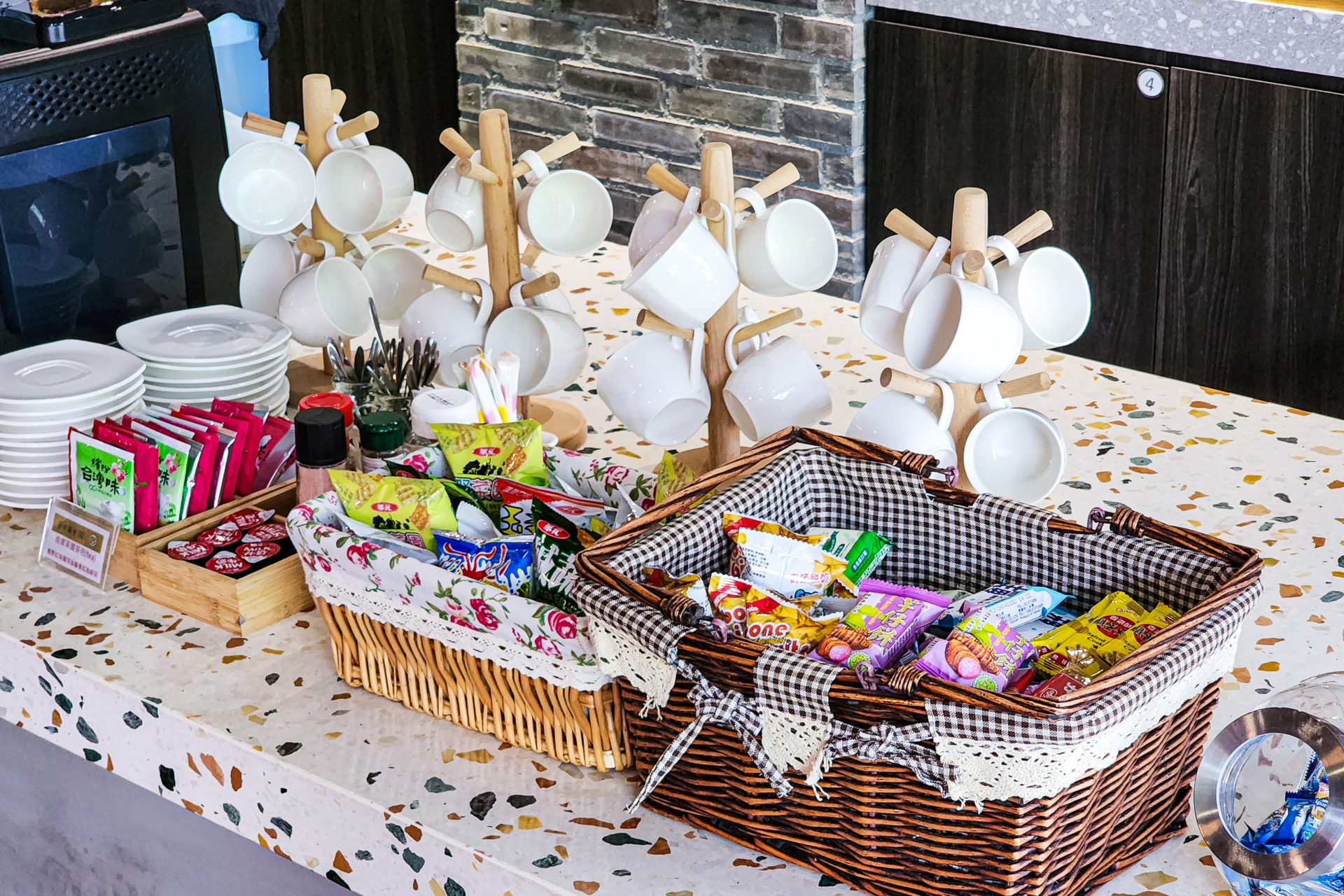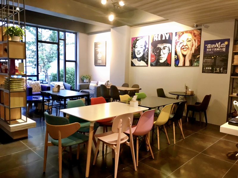 大廳空間提供桌椅、閱讀區、用餐區,並設置咖啡機、沖泡飲品、自家茶園茶包、餅乾點心、泡麵等免費取用。