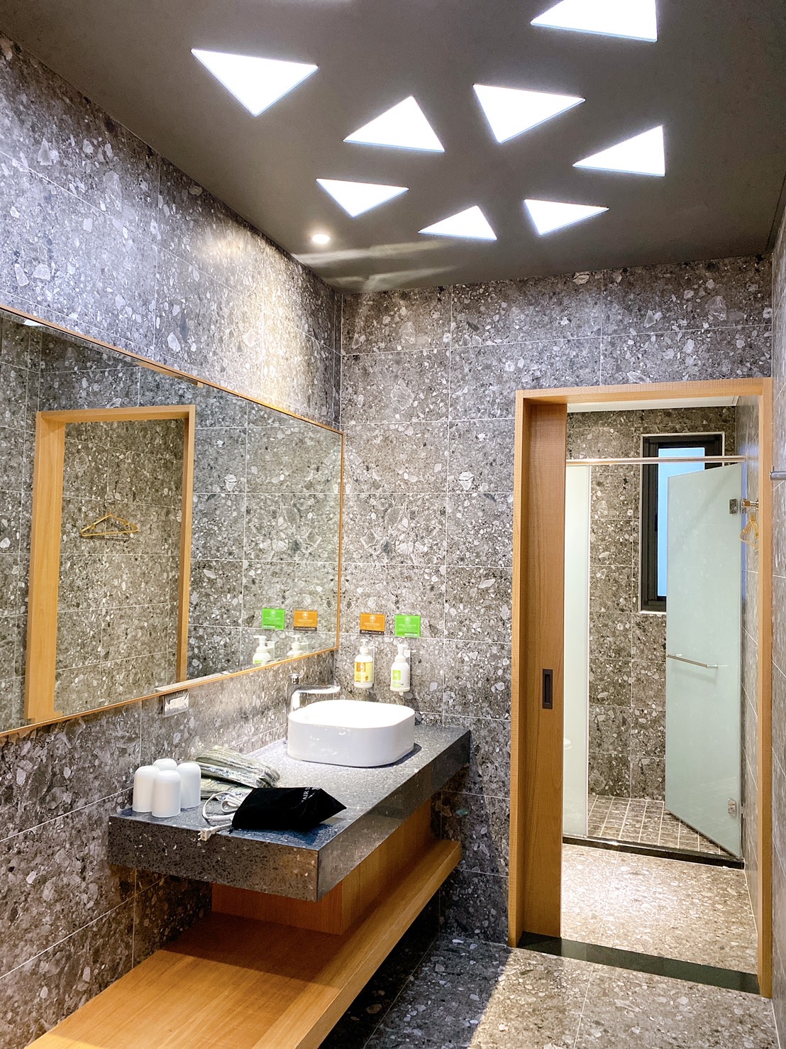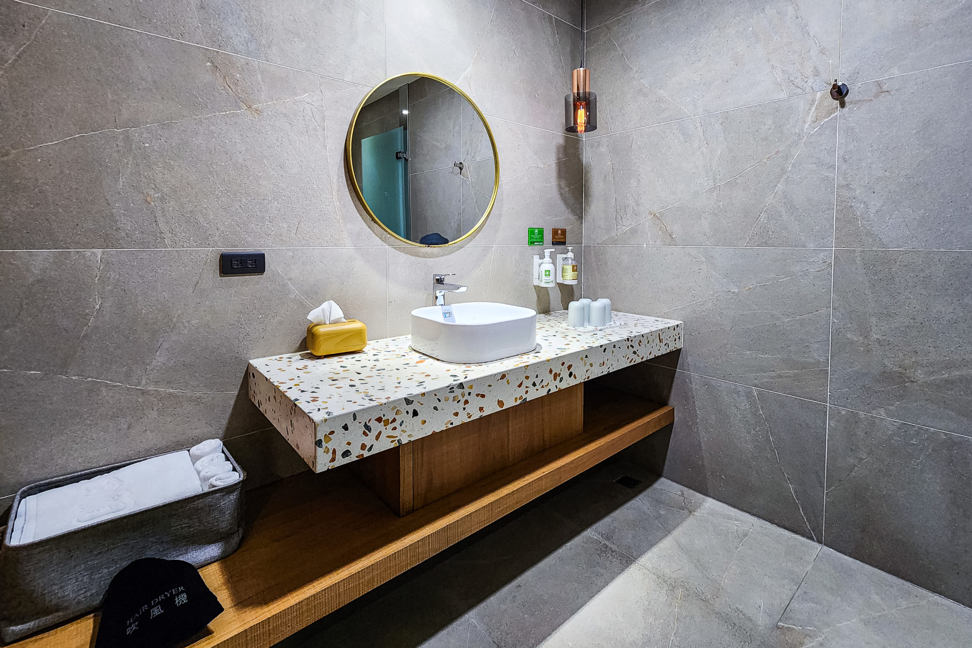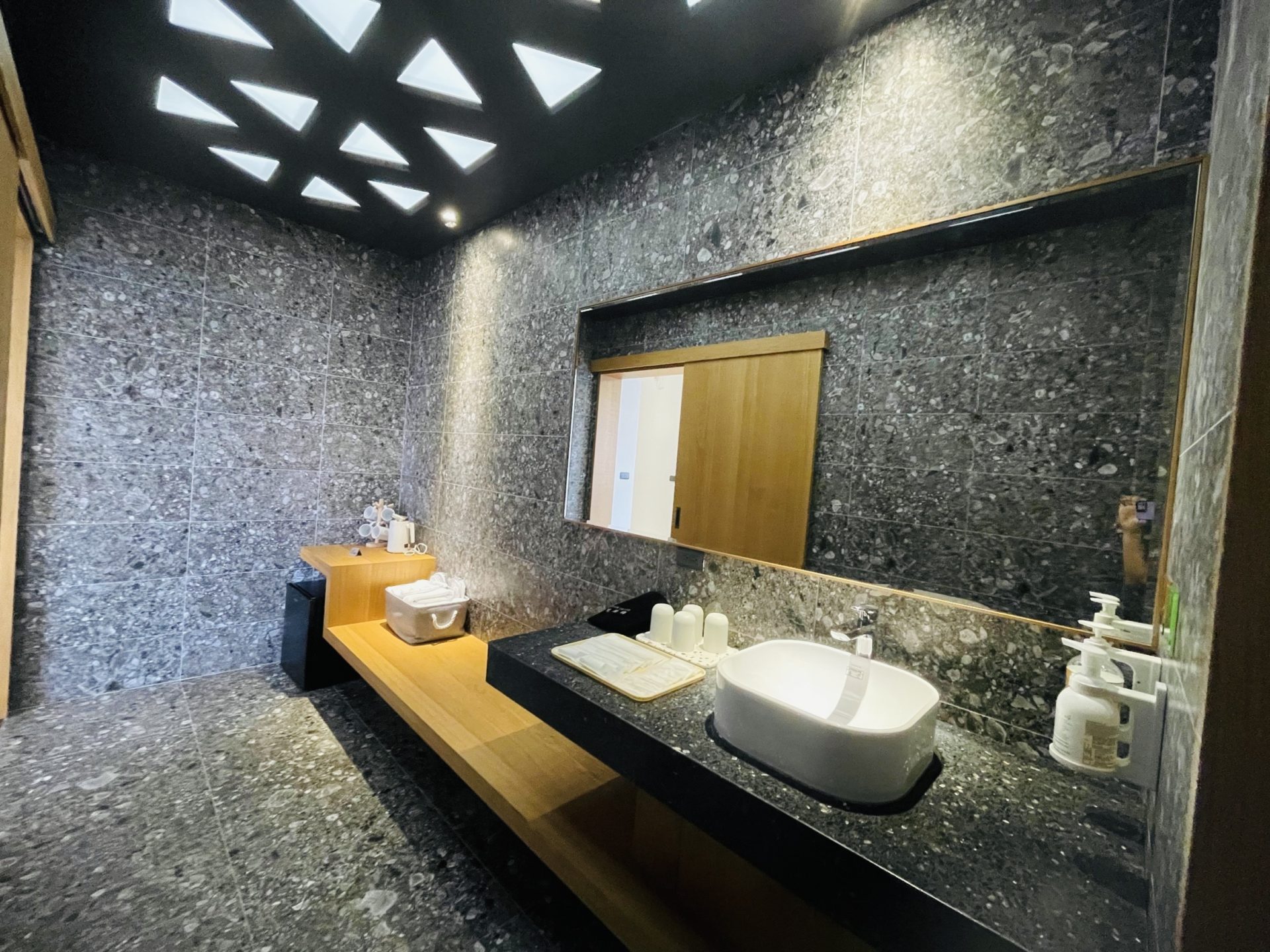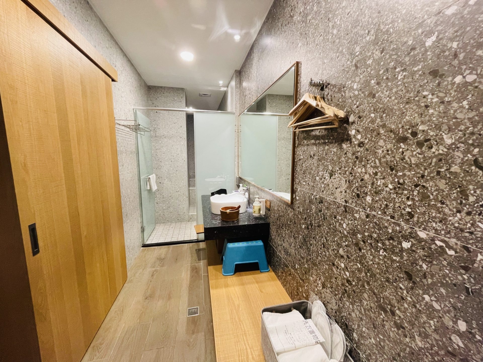 大廳空間提供桌椅、閱讀區、用餐區,並設置咖啡機、沖泡飲品、自家茶園茶包、餅乾點心、泡麵等免費取用。