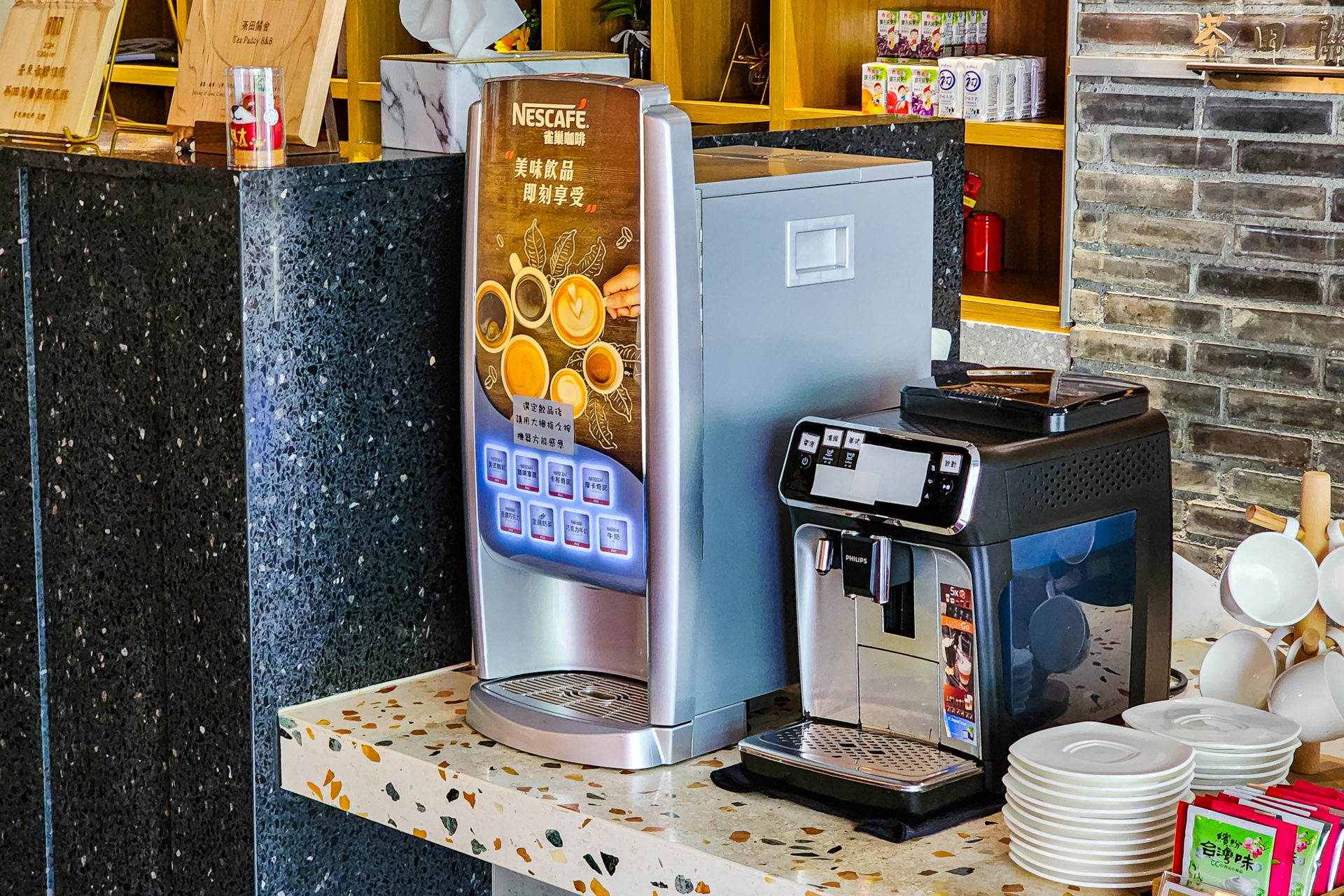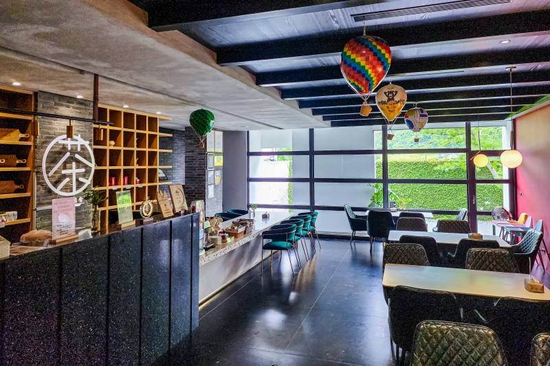 大廳空間提供桌椅、閱讀區、用餐區,並設置飲料機、咖啡機、自家茶園茶包、餅乾點心、泡麵等免費取用。